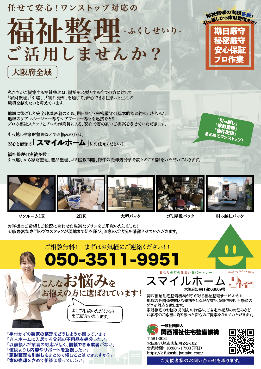 スマイルホームでは、八尾市、柏原市、東大阪市をはじめとした地域のニーズにお応えできるお部屋を多数紹介しております。 また福祉整理に関するご依頼については大阪府内全域で対応可能です。 お客様のご希望に寄り添った安心のご提案をさせていただきます。 |